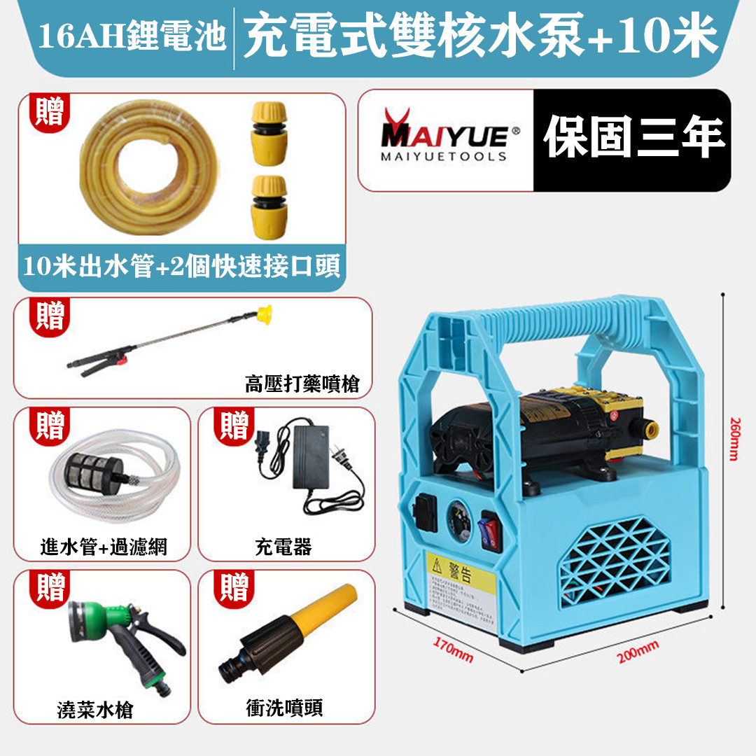 半小時前全台首推,好評爆滿!德國MAIYUE鋰電充電式抽水泵,澆菜/打藥/洗車/灌溉,輕鬆都能搞定‼️ - 16A鋰電雙核水泵[使用時長2-3小時](贈10米水管)